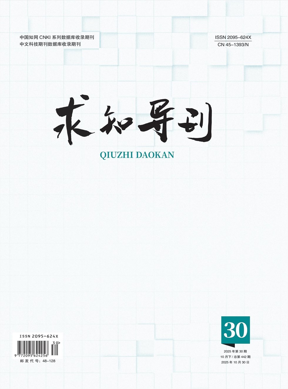 《求知导刊》是经国家新闻出版总署批准登记,广西新闻出版局主管、广西出版杂志社主办的全国优秀刊物。国内外公开发行。国际标准刊号:ISSN 2095-624X;国内统一刊号:CN45-1393/N;邮发代号:48-128,广告许可证号:450000013。系中文科技期刊数据库来源期刊、CNKI中国期刊全文数据库全文收录期刊、中国学术期刊(光盘版)全文收录期刊、龙源国际期刊网全文收录期刊。本刊秉承“弘扬求知精神,促进科教创新”办刊宗旨,注重刊物前沿性、指导性、创新性和实用性,是科教研究交流的窗口,科教成果展示的平台。官网:www.qzdkzz.com电话:0771-5586827投稿邮箱:qzdk@vip.163.com