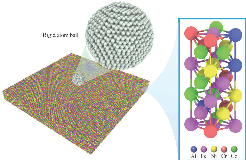 摘要:为了揭示高熵合金(high-entropy alloy,HEA)在冲击载荷下的相结构演变、位错分布、能量吸收及冲击累积效应的变化规律,通过分子动力学模拟,系统探讨了 Al0.3CoCrFeNi 高熵合金板在受单次及二次冲击载荷下的动态响应行为。结果显示,首次冲击下, Al0.3CoCrFeNi 高熵合金板的塑性区域相结构演变和能量吸收方式具有显著的冲击速度依赖性。随着冲击速度的提高,面心立方相结构的比例呈现三阶段下降趋势,而无序化结构则相应增加。在低速(0.5~1.0km/s) 冲击下,能量主要通过位错网络进行吸收;在中速( 1.0~2.0km/s 冲击下,位错与无序化原子共同吸收能量;在高速 (2.0~3.0km/s) 冲击下,无序化原子主导吸收能量。位错线长度在刚性球 0.5~0.8km/s 的冲击速度范围内,随冲击速度的提高呈线性增大,而在更高的速度冲击下,因HEA板厚度限制,位错线长度呈下降趋势。应力分析表明,冲击速度提高时,最大应力与塑性区域边界应力随着冲击速度的提高表现出非线性变化的二次函数关系。二次冲击下,几何特征方面, Al0.3CoCrFeNi 高熵合金板在冲击后形成类梯形的破坏区域,其上坑半径随冲击速度的变化呈现二次函数关系,二次冲击的最小影响区域也与冲击速度呈现二次函数关系;抗冲击性能方面,随着刚性球首次冲击速度的提高,其二次冲击后的剩余速度也随之上升,HEA板材料抵抗冲击性能降低。在距冲击中心 10nm 处,HEA板的弹道极限随首次冲击速度的提高而非线性减小,然而,二次冲击速度的提高会使首次冲击的影响减弱。
