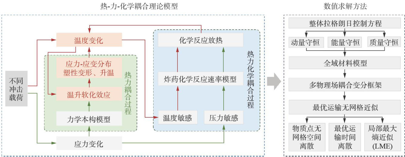 摘要:基于热最优输运无网格(hot optimaltransportation meshfree,HOTM)方法,提出了能够准确预测弹药在冲击载荷下响应特性的无网格数值仿真方法,建立了炸药在冲击载荷下的高精度热-力-化学耦合模型,综合考虑了炸药起爆过程中的温度效应和压力效应,将炸药起爆的Amrhenius热-化学反应耦合模型和局部高压引发的Lee-Tarver压力三项式点火模型有机耦合,实现了对不同冲击速度下炸药不同起爆机制的准确模拟,从而预测弹药在遭受冲击载荷过程中的高速接触、金属外壳大塑性变形、材料断裂、热传导、炸药起爆、化学反应产物膨胀做功等复杂的物理现象。以子弹撞击弹药( 850m/s 和破片撞击弹药( 1850m/s) 2种不同冲击速度的典型冲击场景数值模拟为例,分析了冲击速度对炸药起爆机制和弹药整体响应的影响规律,并与相关试验结果进行了对比。结果表明,本方法可有效刻画冲击作用下的材料大变形、摩擦生热、热点形成及化学反应传播等耦合机制,可为弹药抗冲击设计优化和安全性评估提供可靠的技术支撑。