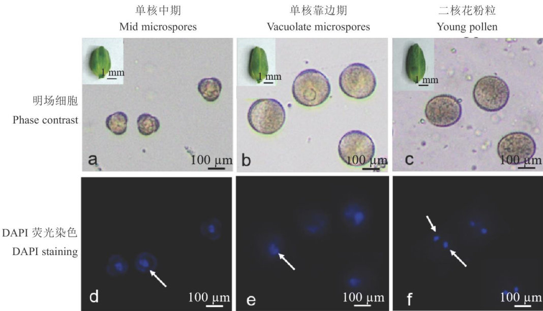 摘要:青花菜 × 甘蓝杂种材料在减数分裂过程中能够产生多种配子类型,产生变异程度较大的新资源,为优化青花菜 × 甘蓝杂种材料游离小孢子体系,获得优质的青花菜双单倍体(double haploid,DH)植株,丰富种质资源。对5份青花菜材料和1份甘蓝材料杂交获得的F分别进行游离小孢子培养,探究花蕾各时期的形态学特征;并研究基因型、蔗糖浓度 、4°C 处理花蕾时间 ,32°C 处理小孢子时间等关键培养因素对小孢子出胚率的影响。结果表明,5份F材料花蕾的P/A(花瓣长度/花药长度)值为0.8\~0.9之间时,花蕾中单核靠边期的小孢子占比为 60%~70% ,最适宜取样;5份材料均能够产生胚状体,胚诱导率为 0.52~16.79 胚·蕾,材料 H1(23ZXQ1×LC18) 的胚诱导率最高,为16.79胚·蕾,后续采用此材料分别进行不同预处理试验。小孢子在N17(含 17% 蔗糖浓度的NLN液体培养基)中预处理,胚诱导率最高,为8.93胚·蕾;花蕾在 4°C 处理3d,小孢子胚诱导率最高,为10.01胚·蕾;小孢子在 32°C 处理3d,胚诱导率最高,为17.96胚·蕾。综上所述,5份F,材料花蕾的P/A值介于0.8\~0.9时,花蕾中单核靠边期小孢子占比最多,可作为花蕾取样的判断标准;花蕾在 4°C 预处理3d、用N17培养基在 32°C 预处理小孢子3d,能够明显提高出胚率。
