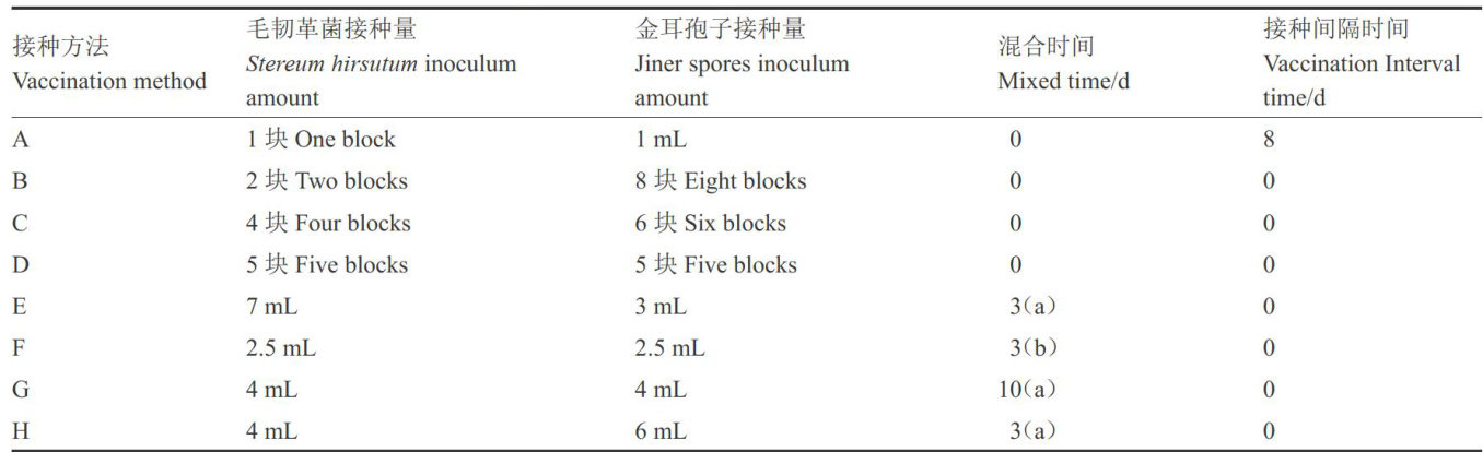 摘要:为了筛选出一种金耳孢子和毛韧革菌栽培金耳的最优接种方法,选择8种不同的金耳孢子和毛韧革菌的接种方法进行栽培出耳试验,初步得到出耳早且金耳子实体品质较好的方法,然后将该方法中的金耳孢子接种量和两菌接种间隔天数这两个条件设置为变量进行对照试验,通过比较菌丝生长速率、满瓶时间、出原基时间、子实体性状和生物学效率等指标,最终得到出耳早且子实体性状优良的接种方法。结果表明,方法A即先接种1块毛韧革菌菌丝块(直径 6mm),8d 后再接种 1mL 金耳孢子液(浓度 1×104mL-1) 菌丝长势最好,金耳出原基最早。对方法A进行进一步优化,得出最佳接种方法A5(先接种1块毛韧革菌、8d后再接种 0.5mL 金耳孢子液),其菌丝长势最好,金耳出原基早(30d),生物学效率最高 (48.4% )。本试验结果为金耳孢子悬浮液和毛韧革菌菌丝体混合接种栽培金耳提供技术支持。