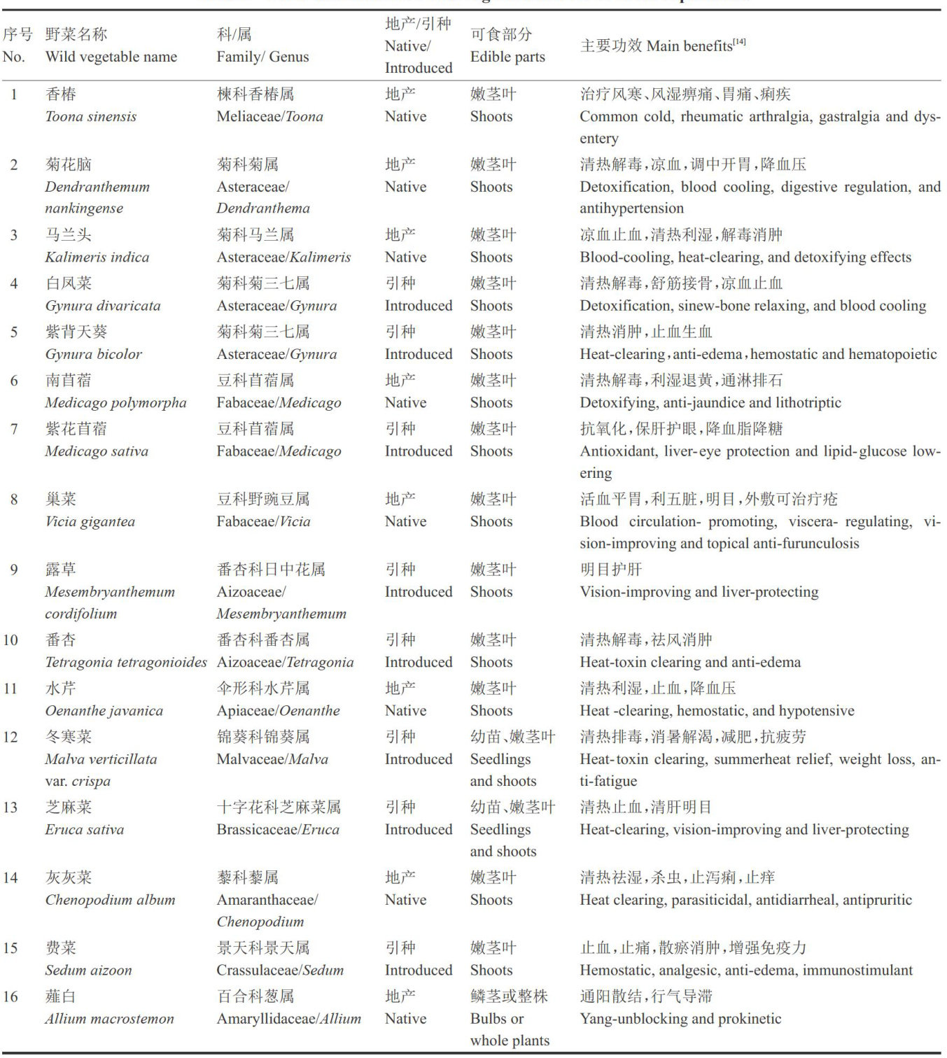 摘要:为筛选适合泰州地区发展的优质野菜资源,本研究选取8种泰州本土野菜和8种引种野菜,在标准化栽培条件下进行种植试验,系统比较分析其营养成分和抗营养因子含量,综合评价其营养品质与食用安全性。结果表明,在仅施加少量有机肥时,16种野菜的维生素C含量 (6.80~1066.00μg?g-1) 、总黄酮含量 (0.25~36.10mg?g-1) 、类胡萝卜素含量 10.60~222.40μg?g-1) 以及矿质营养元素含量均很丰富,且硝态氮含量 (7.96~409.63μg?g-1) 、草酸含量 (8.10~ 3205.20μg?g-1) 及重金属元素(Pb、Cd)含量普遍低于食品安全限值。但有机肥施用可导致部分野菜中As累积较高 (0.05~ 2.80μg?g-1) 。本土野菜中,香椿、马兰头、南苜蓿等的综合营养价值较高,值得深入开发;灰灰菜、番杏、露草等需关注硝态氮累积问题,白凤菜、芝麻菜需警惕重金属风险。本研究结果为泰州地区野菜资源的开发利用提供了科学依据。