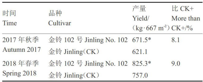 摘要:金铃102号南瓜是以小蜜13为母本、台1-9为父本配置而成的肉用小果型中国南瓜杂种1代新品种。该品种中早熟,春季播种至始收约109d、秋季85d。果实梨形,平均纵径 16cm 、横径 12.5cm ,平均单果质量 1.1kg 。表皮深绿色带浅黄色斑纹,光滑、光泽强,不易发生裂果及锈斑,棱沟浅或无。果肉黄色,果肉厚度约 2.2cm ,水分含量 Π(μ) 后同 84.72g?100g-1 ,淀粉含量 6.58g·100g-1 ,可溶性糖含量 3.34g·100g-1 ,粗纤维含量 0.8g·100g-1 。果实蒸煮口感风味佳,肉质细腻、糯(黏)性强,板栗味浓、纯正,皮感弱,放置一段时间后逐渐变清甜,但糯(黏)性减弱,可带皮食用。植株田间表现抗白粉病等主要病害,耐湿性、耐涝性强,耐阴、耐旱性较弱,适合广东、湖南、湖北、云南、贵州等低海拔地区露地种植, 667m2 产量在 1500kg 左右。2023年通过广东省农作物品种审定委员会评定。