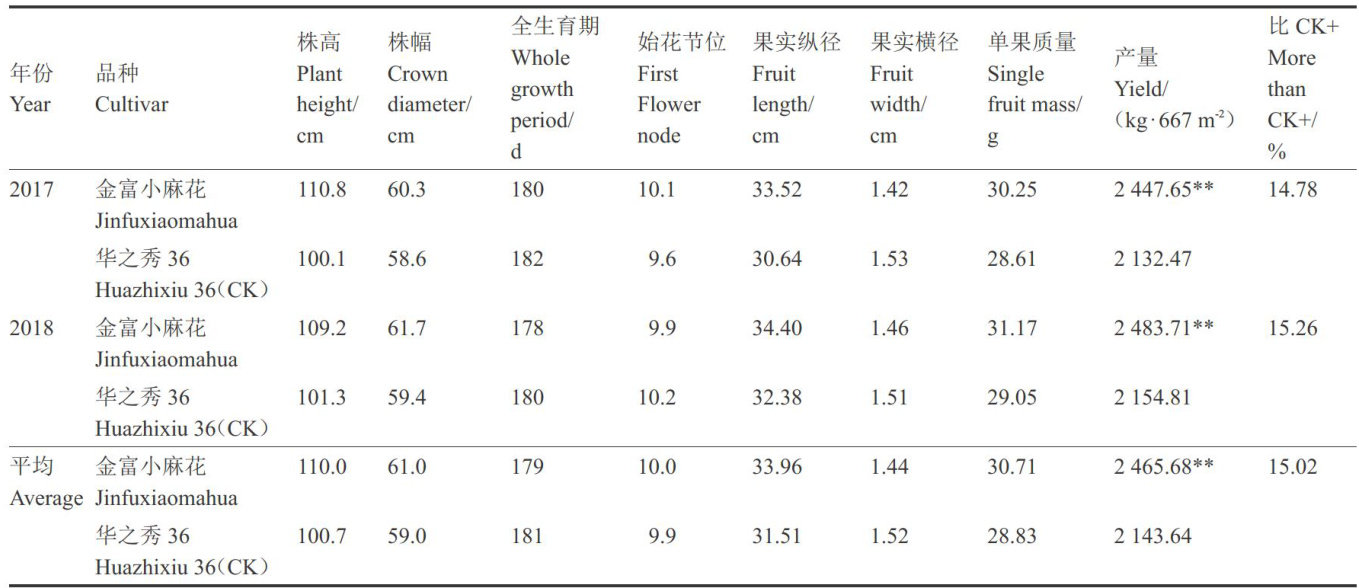 摘要:金富小麻花是以自交系P2015-3为母本、自交系P2011-3为父本配置而成的杂交1代线椒新品种。该品种植株生长势强,半直立型,茎秆粗壮,叶片绿色,卵圆形。坐果能力强,果实线形,青熟果绿色,熟果红色。在河南春季保护地栽培生育期179d,株高 110cm ,株幅 61cm ,始花节位10节。果实纵径 33.96cm 、横径 1.44cm ,平均单果质量 30.71g ,果肉厚度 0.1cm ,平均心室数3个。果实维生素C含量 (w ,后同) 145mg?100g-1 、辣椒素含量20.2mg?kg-1 ,中等辣味。中抗CMV、TMV、疫病,抗炭疽病。平均 667m2 产量 2459.52kg ,适宜在河南、山东、河北等地春秋保护地栽培。2023年6月通过农业农村部非主要农作物品种登记。