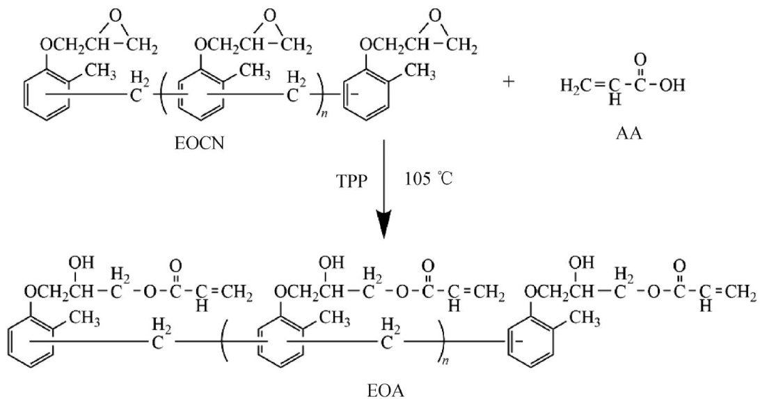 摘要:针对丙烯酸树脂在紫外光固化过程中存在的深层固化程度不足、热机械性能欠佳及附着力较差等问题,以邻甲酚醛环氧树脂和丙烯酸为原料,通过开环反应成功合成了一种新型光敏性邻甲酚醛环氧丙烯酸树脂(EOA)。以EOA作为主体树脂,系统研究了I型引发剂907和Ⅱ型引发剂ITX对EOA固化膜表层及深层双键转化率、热力学性能、铅笔硬度和附着力的协同影响机制。结果表明:当引发剂907与ITX以 10:1 的比例复配且总质量分数为 4% 时,EOA光固化膜表现出优异的综合性能。其中,深层双键转化率达到76.2% ,较单独使用907时提升了 22.1% ;玻璃化转变温度( Tg) 提升至 161.6°C ,增幅达 9.1% ;储能模量达到3259.5MPa ,提高了 21.1% 。同时,固化膜的铅笔硬度达到5H,附着力为0级,各项性能指标均得到显著改善。研究结果可为开发高性能紫外光固化材料提供新的思路和方法。