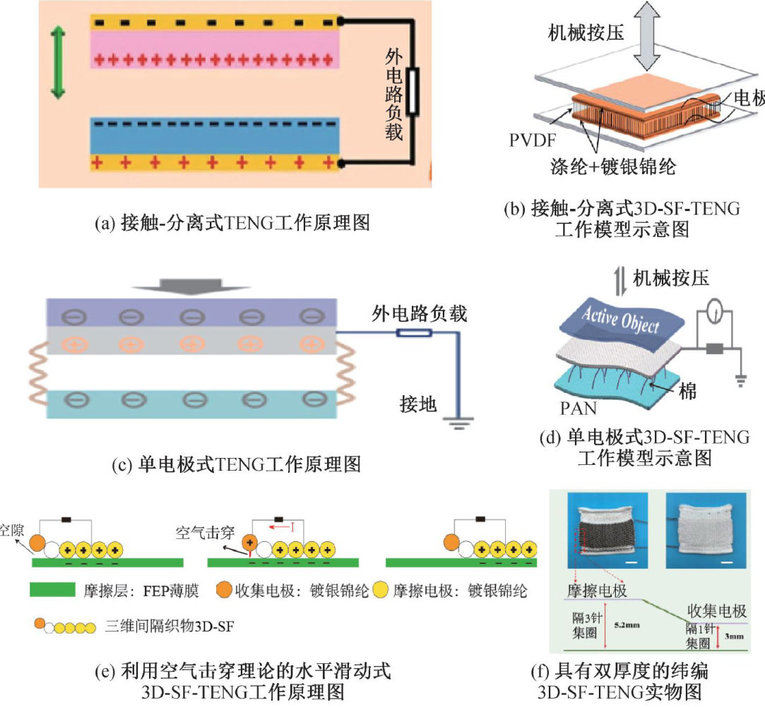 摘要:近年来,柔性电子技术与智能可穿戴设备的快速发展对可持续能源供给提出了更高要求。作为新型能量收集器件,三维间隔织物摩擦纳米发电机(3D-SF-TENG)凭借其特殊结构、高回弹及透气性等特性,成为可穿戴供能领域的研究热点。介绍了3D-SF-TENG的工作原理,分析了其制备技术(包括三维间隔织物的编织工艺、介电-导电材料集成策略及重要结构因素),总结了其在人体运动能量回收、柔性压力传感及自供电运动监测等智能可穿戴场景中的应用进展,并进一步探讨了3D-SF-TENG研究的局限性和目前所面临的挑战。综述结果可为3D-SF-TENG的进一步研究提供参考。