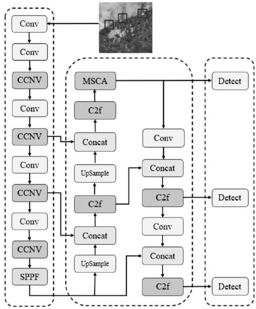 摘要:为解决传统深度学习方法在复杂森林环境下响应延迟和小火源识别精度不足的问题,本文提出轻量级森林火灾检测算法YOLOv8-CM。算法采用ConvNeXtV2模块实现轻量化,通过深度可分离卷积和通道重校准,使参数量和计算复杂度分别降低 8.2% 和 8.6% 。引入多频谱通道注意力机制(MSCA),结合频域特征增强与空间注意力,提升小目标检测能力并抑制背景干扰。在自建数据集上,YOLOv8-CM与YOLOv8n相比,在精确率、召回率和 mAP@0.5 上分别提升2.5%.0.9% 和 2.7% ,单帧推理时间小于 15.6ms ,为森林火灾早期监测提供了高效解决方案。